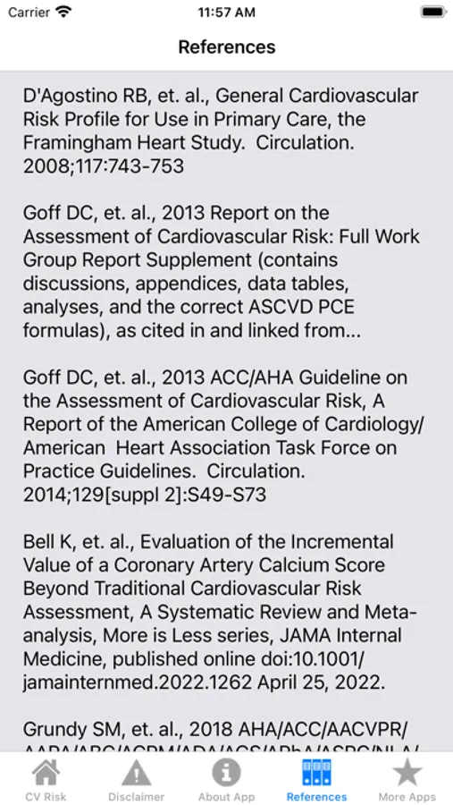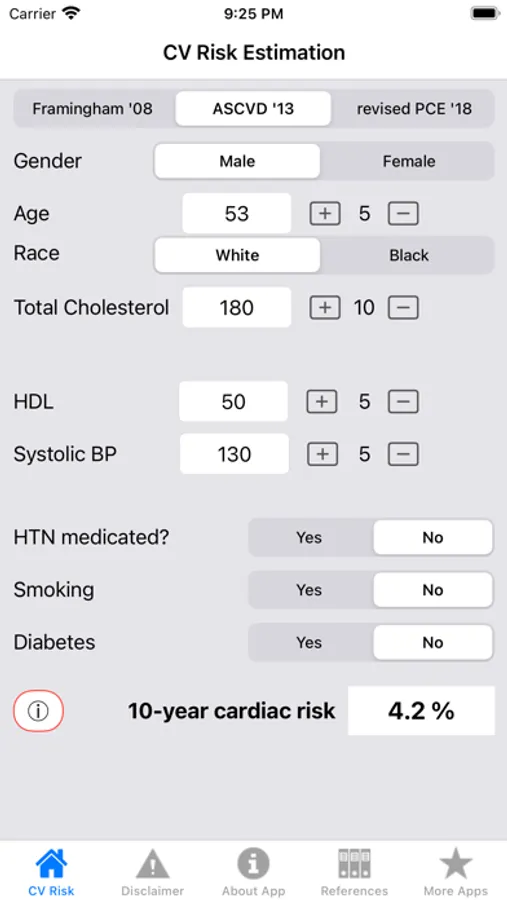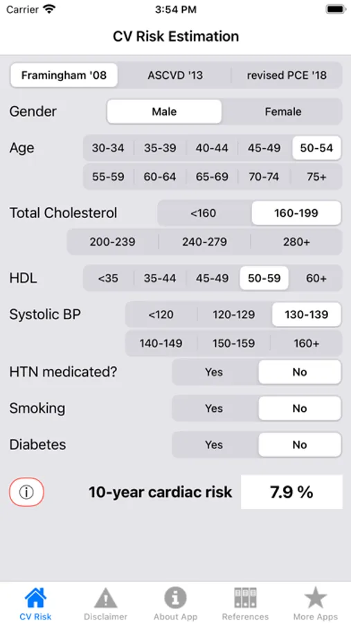 This app is for CLINICIANS, not the lay public. The CV Risk app presents clinicians with three valuable 10-year cardiovascular event risk calculators to serve clinicians and learners in primary prevention of cardiovascular disease. It is for clinicians only, not the lay public. The calculators are Framingham 2008, ASCVD 2013, and the revised pooled cohort equations ASCVD of 2018.