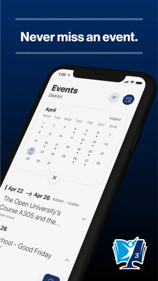 The event section shows a list of events throughout the district. Users can add an event to their calendar to share the event with friends and family with one tap.
