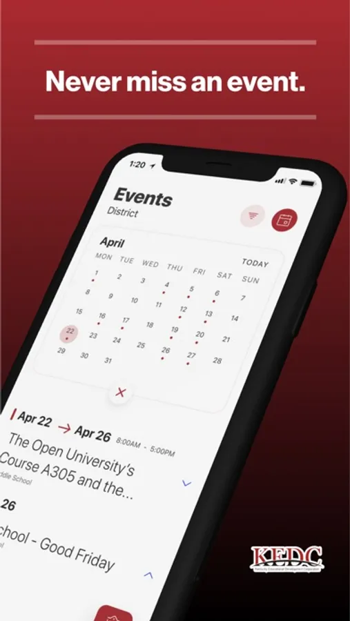 The event section shows a list of events throughout the district. Users can add an event to their calendar to share the event with friends and family with one tap.