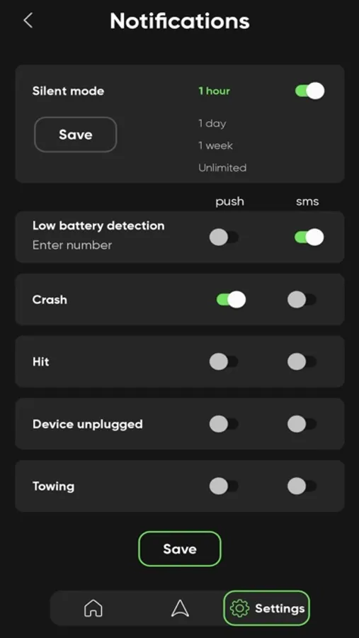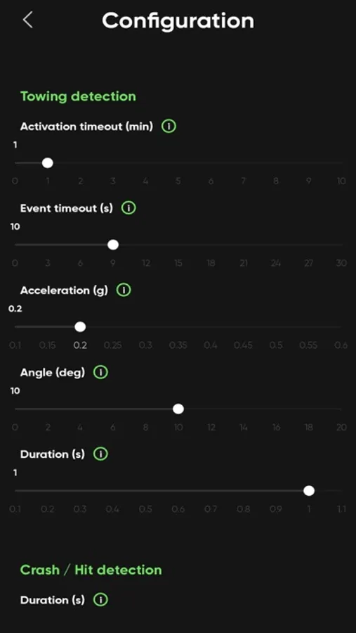 Smart notifications of hits/crashes/towing/device disconnection;