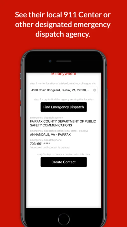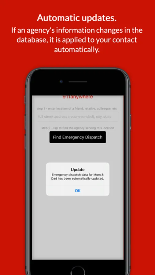911anywhere uses ArcGIS geolocation data and a proprietary database built with publicly available 911/emergency dispatch agency contact and coverage data from sources such as DHS, FCC, public records and direct outreach to agencies themselves. Refinements and updates of the 911anywhere database are continuous. Each time the app is opened, all agency information for saved contacts will have been checked against the database within recent weeks, with updates automatically and instantly applied to saved contacts.
