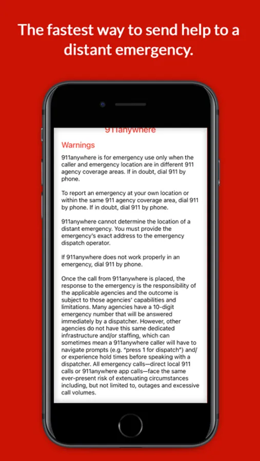 Once the call from 911anywhere is placed, the response to the emergency is the responsibility of the applicable agencies and the outcome is subject to those agencies’ capabilities and limitations. Many agencies have a 10-digit emergency number that will be answered immediately by a dispatcher. However, other agencies do not have this same dedicated infrastructure and/or staffing, which can sometimes mean a 911anywhere caller will have to navigate prompts (e.g. “press 1 for dispatch”) and/or experience hold times before speaking with a dispatcher. All emergency calls—direct local 911 calls or 911anywhere app calls—face the same ever-present risk of extenuating circumstances including, but not limited to, outages and excessive call volumes.