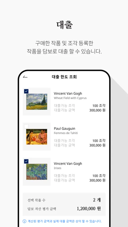 작품 및 조각을 담보로 대출 할수 있습니다.