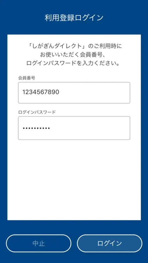 2.「利用登録ログイン」画面にて、『しがぎん』ダイレクトの会員番号とログインパスワードを入力し、【ログイン】をタップ。
