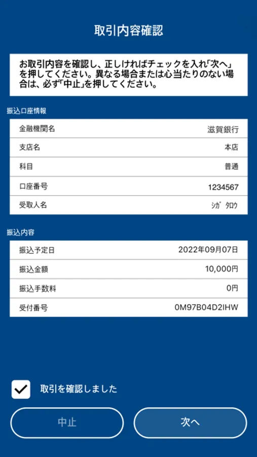 また、お振込や各種料金の払込み時には、アプリ上で振込先や振込金額などのお取引内容を確認し、承認していただくことで取引が完了する「トランザクション認証」を導入しています。