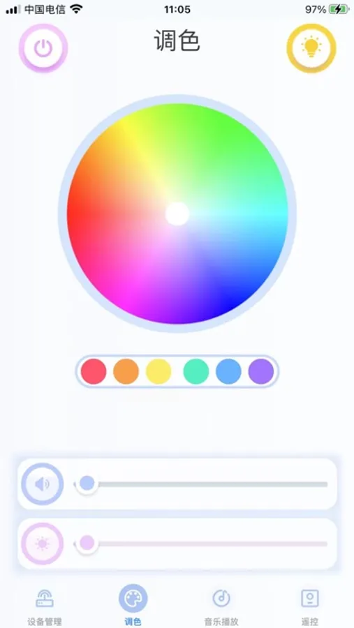 控制蓝牙音乐灯,可以开关,调色,调节亮度和音乐大小。