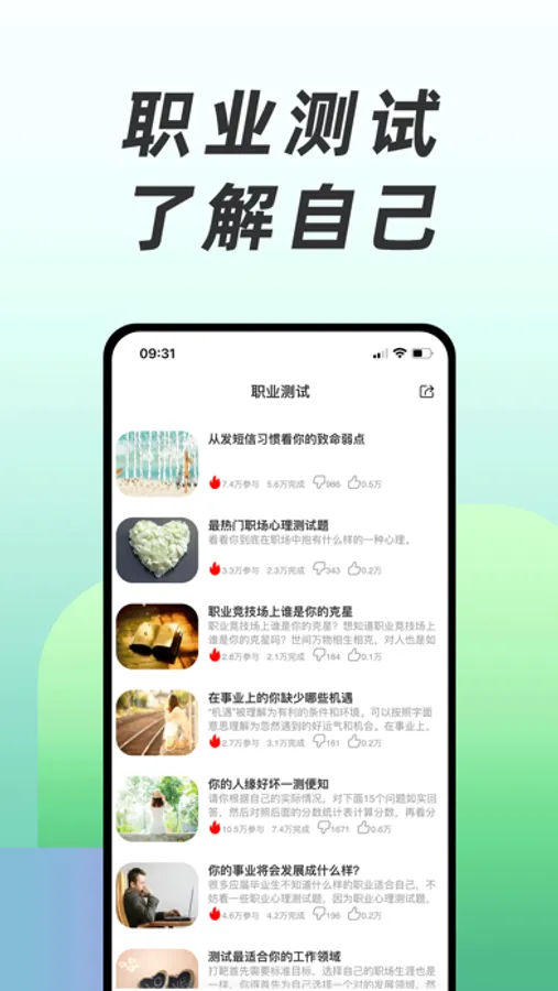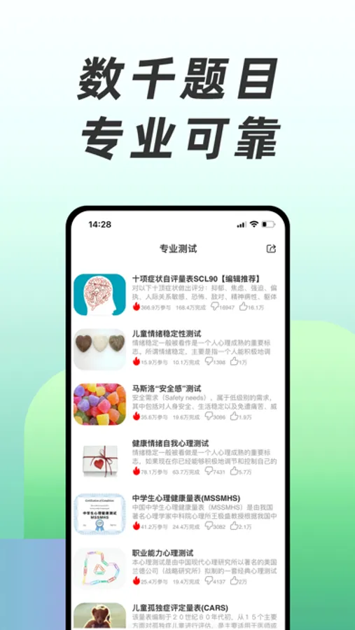 给力专业心理测试软件无需注册,无需转发即可取得测试结果,看不懂测试结果还可在线得到给力心理咨询师为您专业解读测试结果进行壹对壹心理分析。给力心理测试软件提供心理测试,职业测试,爱情测试,趣味测试等项目。专业心理测试有包括:十项症状自评量表SCL90,抑郁自评量表(SDS),MBTI职业性格测试,Sarason考试焦虑量表(TAS),健康情绪自我心理测试,马斯洛“安全感”测试,儿童情绪稳定性测试,中学生心理健康量表(MSSMHS),职业能力心理测试,儿童孤独症评定量表(CARS),恐惧症自测,16型人格测试,九型人格测试等内容。心理测评可以帮助心理测评者了解自己的心理健康状况,通过心理评测唤醒人们心理健康的意识,知道自己怎样来预防和治疗心理疾病;指导人们如何在生活当中来调节自己的心态,从而提高生活质量,透视心灵的窗户来测出您心理健康状态!心理测评也是各机关、企业、组织等用来选拔人才、安置岗位,以及对一个人进行诊断、评价、辅助咨询的一种手段,它包含能力测试、人格测试和兴趣测试等。经常能见到社交平台上大家吐槽:“入职XX公司性格测试没过!”。性格测试不仅很重要,有时候还有“一票否决权”。大厂求职的朋友可以先自行做下职业测试:MBTI职业性格测试,九型人格测试等,了解自己是否和公司职务匹配。此外,还有给力心理软件还有其他健康测试、情感测试、性格测试、爱情测试、测测星座运势、智商测试、情商测试、焦虑症测试等心理测试服务。人是发展成长和变化的,因此心理测评具有一定的时效性,此测试结果可以提供一定的参考。
