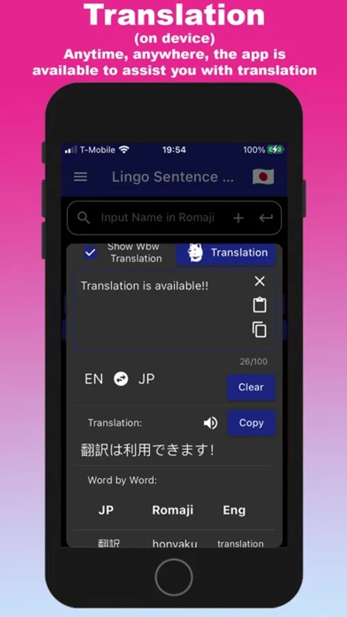 NEW!!! Complete on-device Japanese-English and English-Japanese translation at your fingertips. (Internet/cell phone data not required). Language assistance wherever and whenever you need it. We are not in the business of collecting data. Your privacy is our guarantee here at Lingo Language Tools.