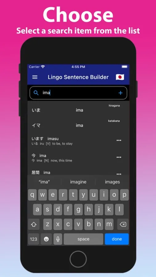 • Select the word or phrase you wish from a selectable list that automatically updates and refines your list from each letter you input into the Lingo app or from a list of direct kana conversions (such as hiragana or katakana).