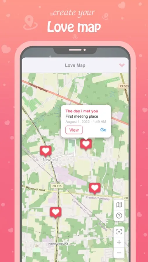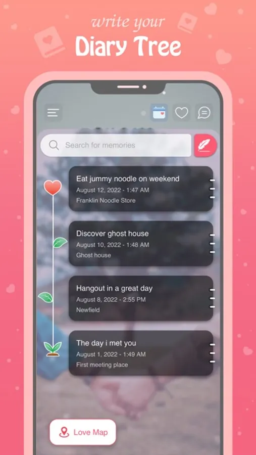 Love Paradise will help you create your own love map. Love map is a map based on your created diaries. It'll show locations which you and your lover have been there together.
