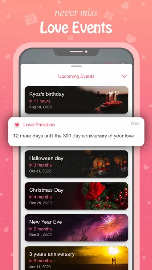 Love Paradise will display all the upcoming love events for you, and what's even better is that the app will also send notifications to remind you of anniversaries, holidays for lovers, even birthdays. of your lover.