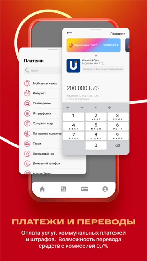 оплата услуг, коммунальных платежей и штрафов. Возможность перевода средств с комиссией 0,7%