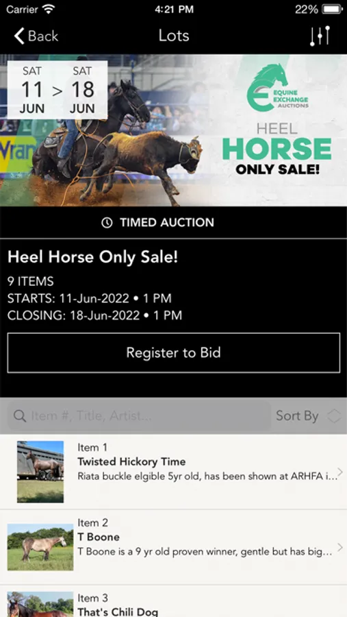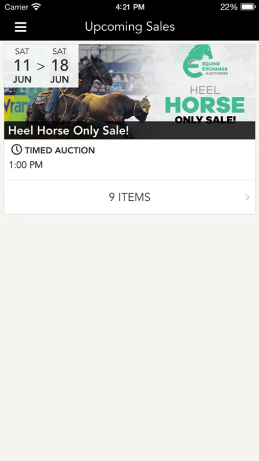 Equine Exchange Auctions is the best app to auction and buy performance horses across all disciplines. With Equine Exchange Auctions, you can preview, watch, and bid in our auctions from your mobile/tablet device. Participate in our sales while on-the-go and gain access to our following features: quick registration Following upcoming horses of interest push notifications to ensure you engage on horses of interest track bidding history and activity watch live auctions #1 source for the performance horse.