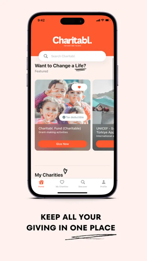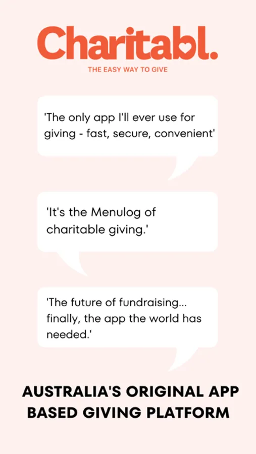 Charitabl. is Australia's original app-based donation platform, hosting over 39,000 of the most reputable charities, giving you the ability to make a difference from one simple swipe. Once you've registered, you're good to go. No more multiple credit card entries, no more worrying about whether your money is going to the right place, or finding all your receipts each year, Charitabl. keeps all your giving in one place. It's just straight up generosity with the inconvenience taken out.