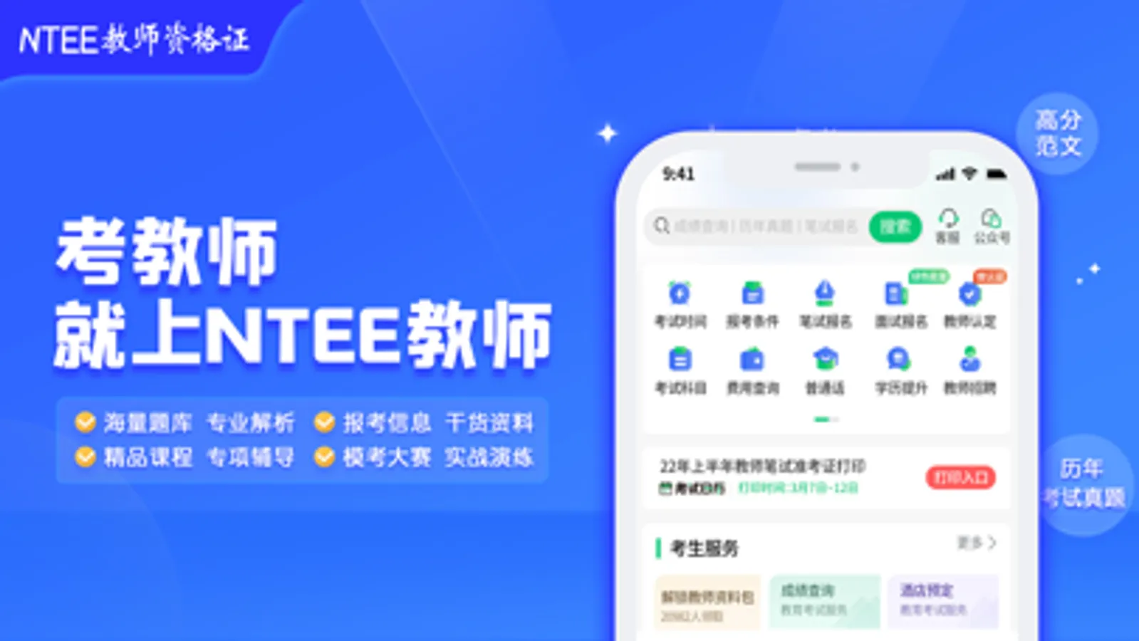 满足考教师用户对考试政策,笔试面试报考时间,成绩查询,教师认定指导,普通话培训,学习备考等需求,是教师类考试的好帮手。内有模拟真题库有试题视频解析、章节强化训练、高频考点、历年真题、通关课程、普通话培训、考生交流群;