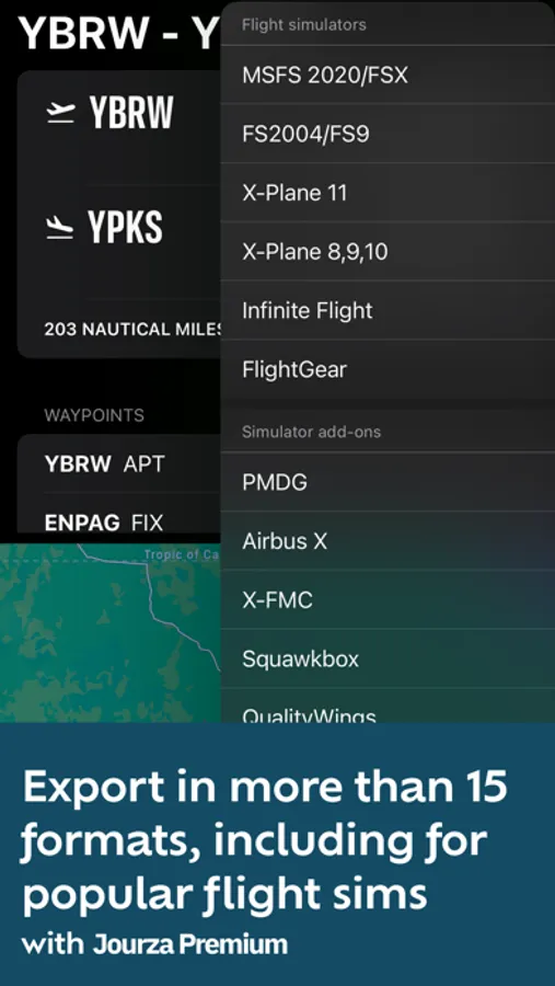 Export flight plans to more than 15 formats, including Microsoft Flight Simulator, FSX, X-Plane, JSON, CSV, and more! And, check weather conditions before you take off for both ends of your journey. Available with Jourza Premium.