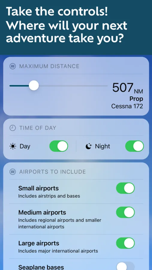 With Jourza, the sky's the limit! Choose the range of your aircraft, or pick an area of the map, then get ready to fly under the stars, and land at the most spectacular airports around the world.