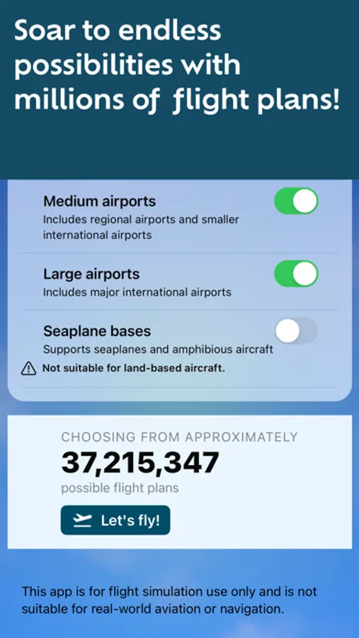 Jourza generates infinite flight plans for flight simulation use, but is not suitable for real-world aviation or navigation. Terms of use available at https://www.apple.com/legal/internet-services/itunes/dev/stdeula/