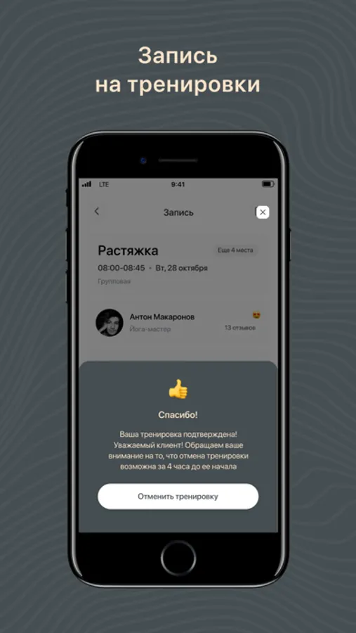 - Получать PUSH-уведомления о предстоящей тренировке;