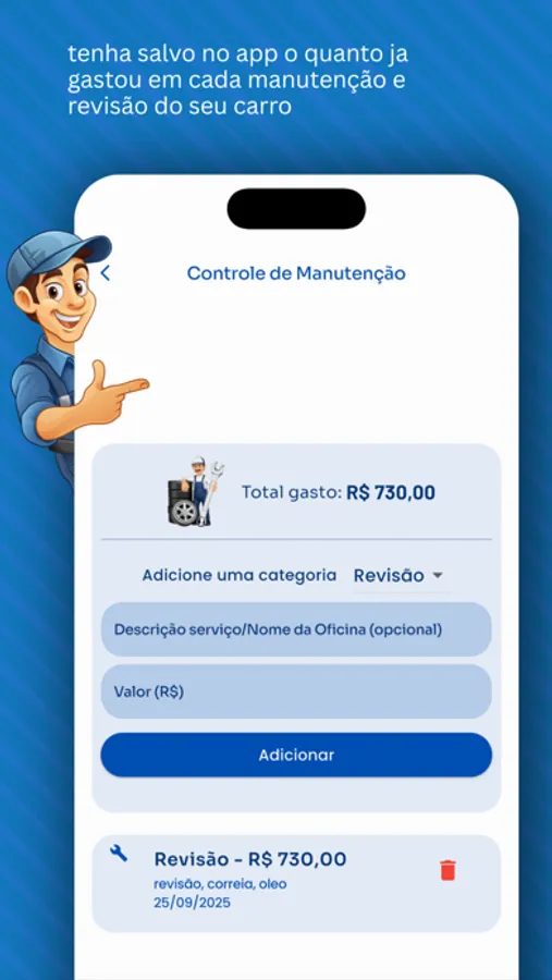 Chega de anotações em papel, planilhas complicadas ou esquecer quando trocar o óleo.