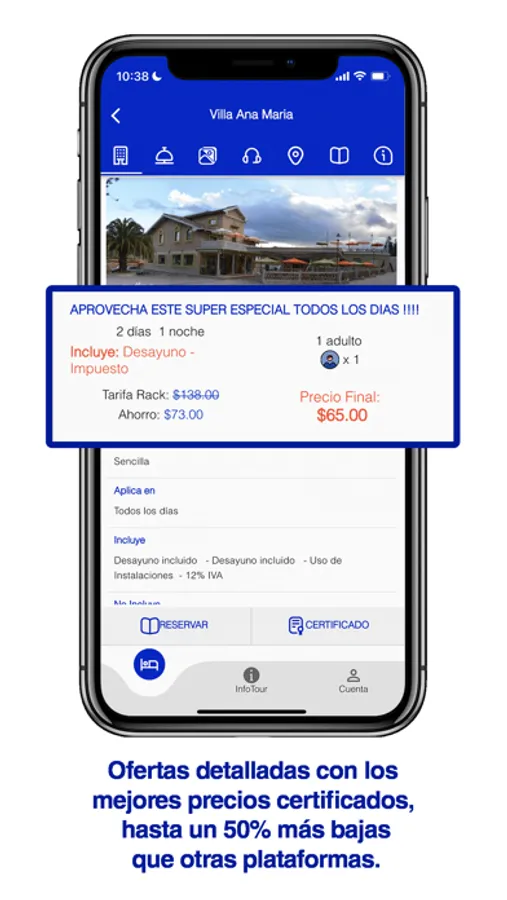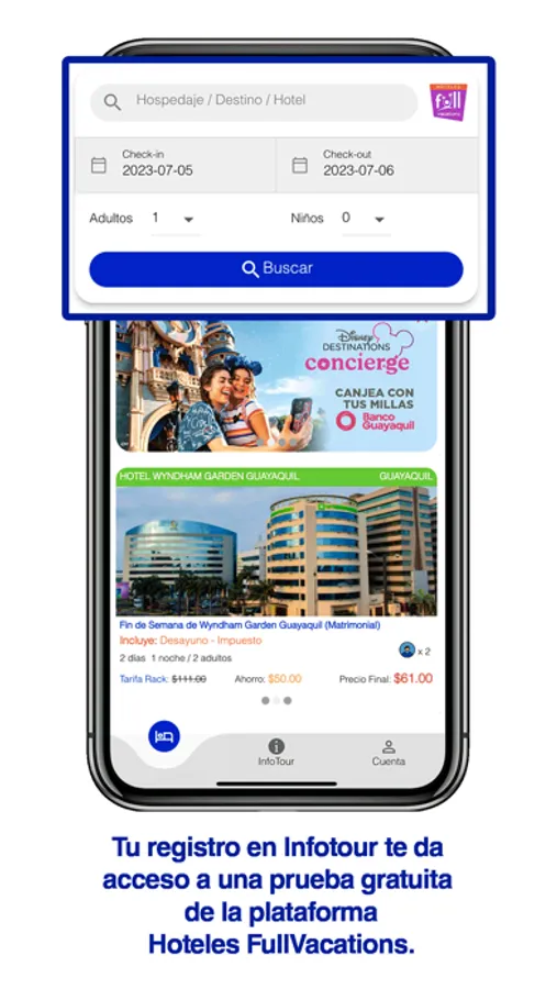 Tu registro en Infotour incluye el beneficio de acceder a una prueba gratuita de la plataforma Hoteles Full Vacations, para que puedas realizar una reserva del hotel de tu preferencia con hasta un 50% de descuento en el precio final en comparación con todas las demás plataformas de reservas del mundo.