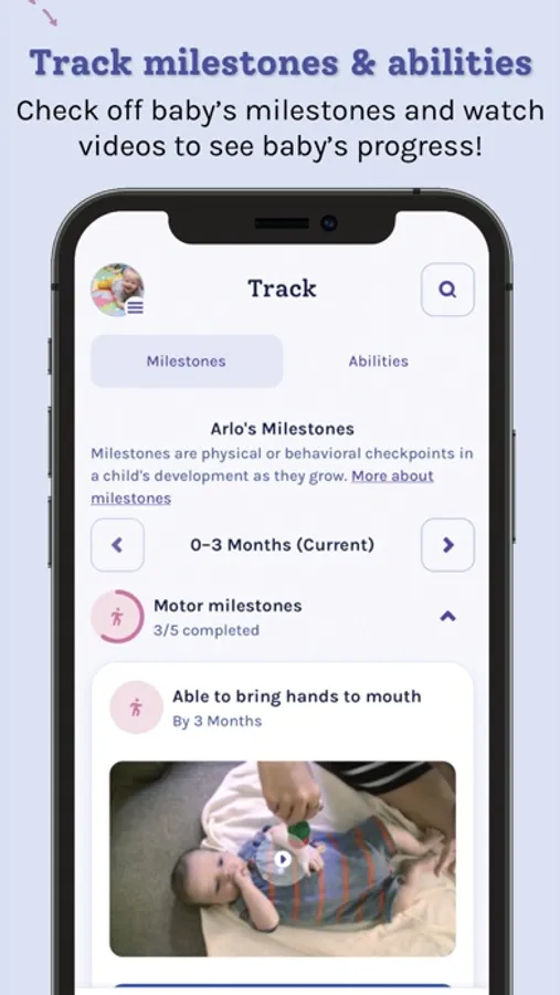 • Milestones specific to baby’s age, which can be tracked and checked off in their profile
