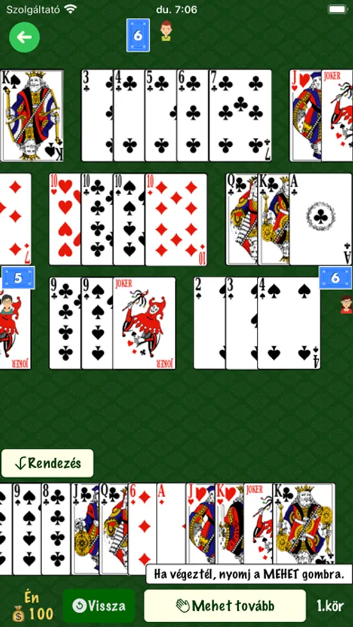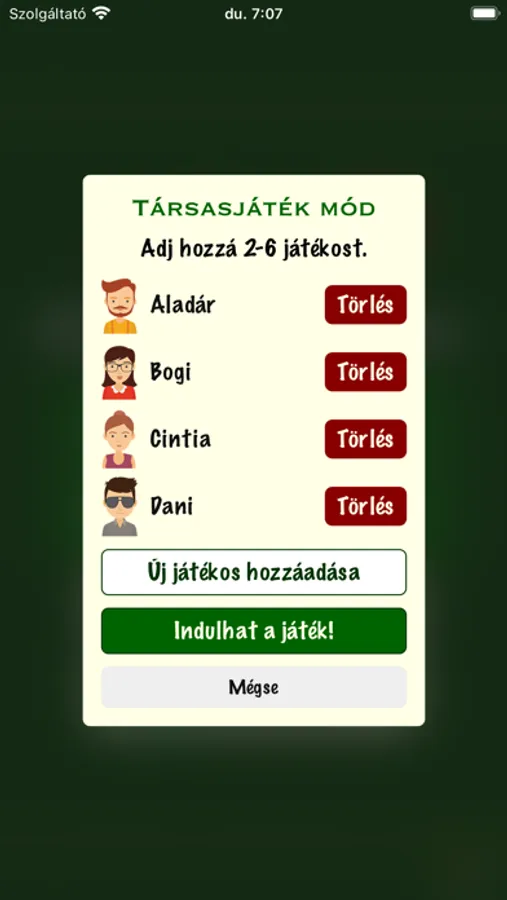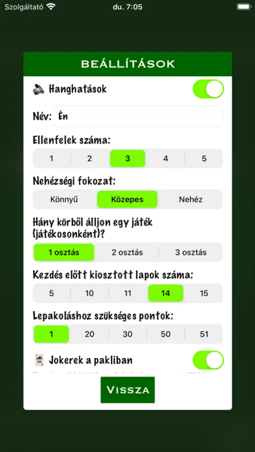 -illetve az ellenfelek száma gépi játék esetén (2-5), és hogy hány körből álljon a játék (játékosonként 1-2-3 osztás)