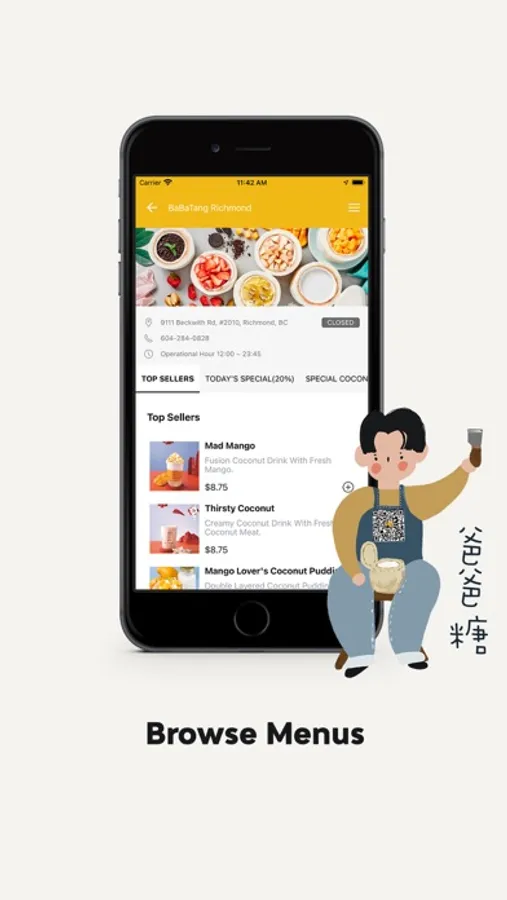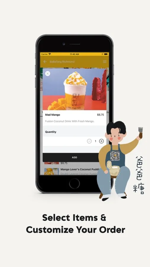 Baba Tang offers an array of coconut desserts (served in actual coconuts) as well as beverages like bubble tea made with coconut milk and fresh fruit such as fresh, juicy mango.