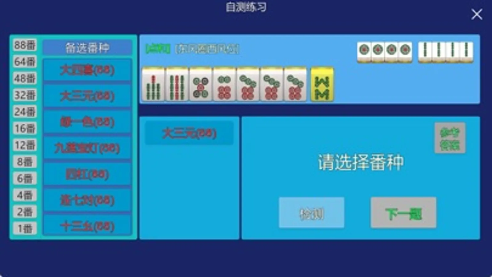 由于国标麻将的番种繁多,对新手不太友好,所以,就制作了本软件。为玩家扫清国标麻将的学习障碍。通过一段时间的学习,练习,玩家的水平必定突飞猛进。