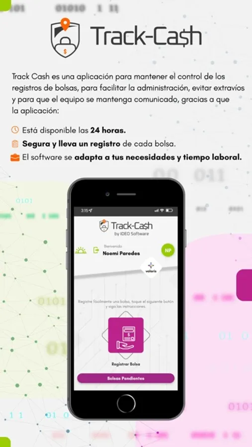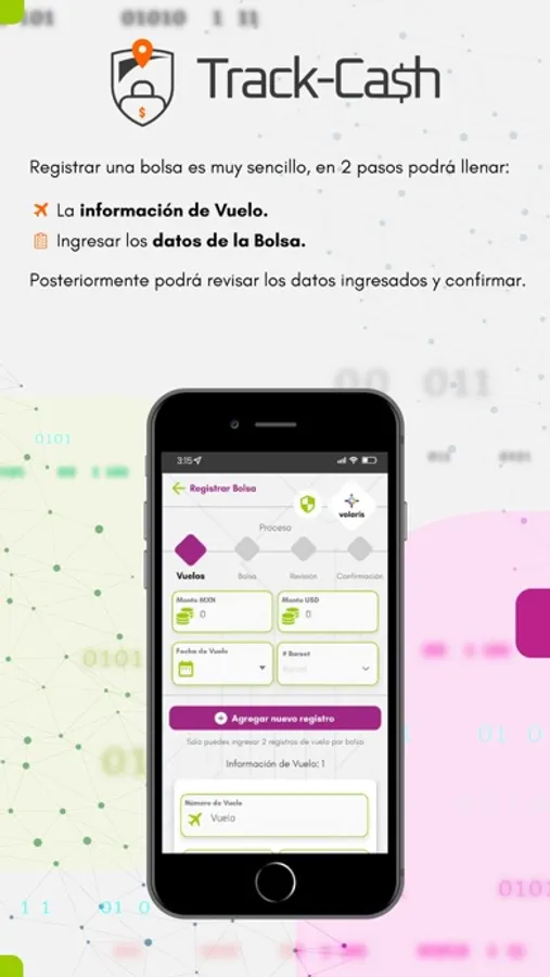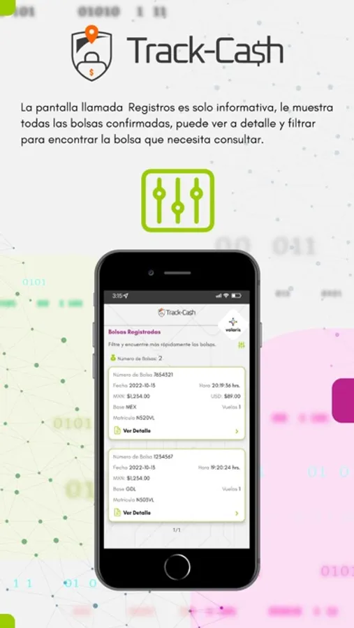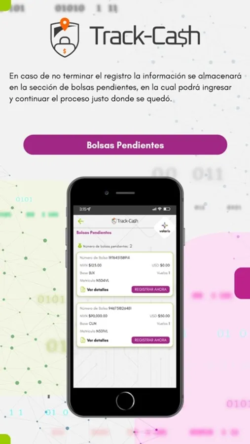 Track Cash es una aplicación móvil desarrollada para la administración y control de las bolsas utilizadas en los vuelos, la cual te permite registrar bolsas y mantenerlas con estatus de pendiente o consultar la información después de su registro, como:
