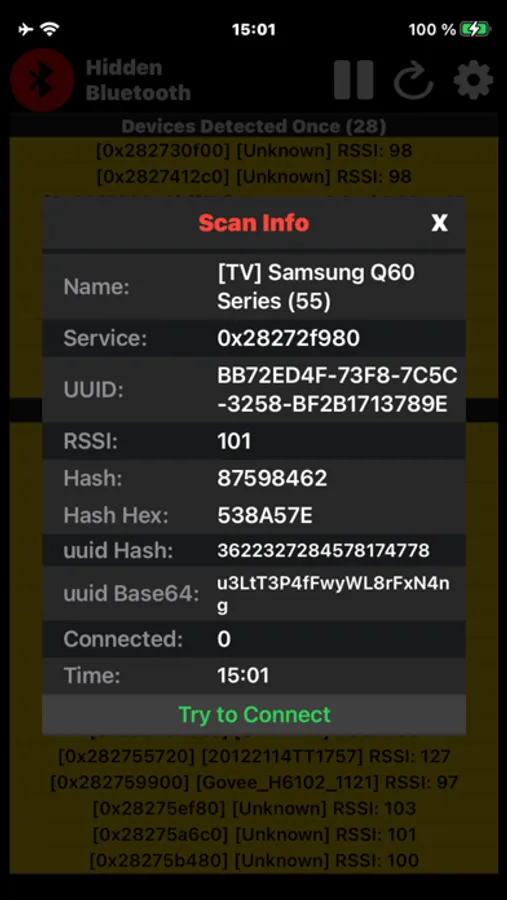 - Try to Connect to the device and read more info like Services, CBService, amps, etc.
