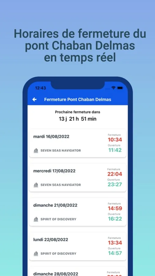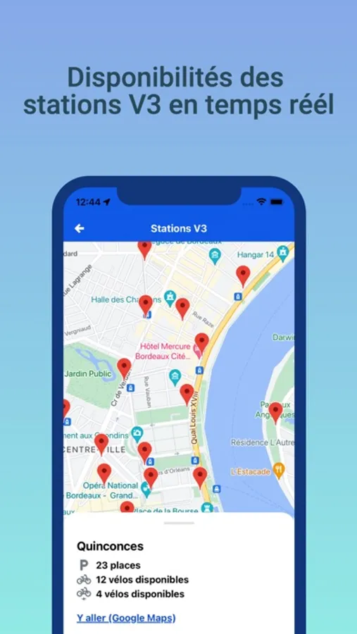 Vous pouvez accéder aux horaires de fermeture du Pont Chaban Delmas, voir les disponibilités des stations V3 en temps réel, mais également voir où sont localisées les toilettes publiques, les fontaines à eau, les arceaux pour garer son vélo.