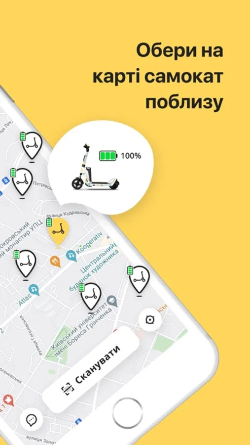 - Знайти на карті або на найближчій парковці електросамокат.