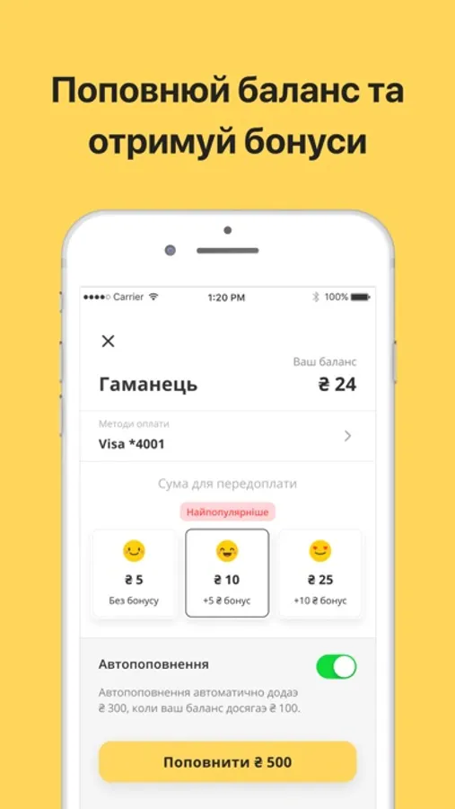 Актуальну вартість оренди ви можете побачити в додатку, натиснувши на значок електросамоката. Ви також можете купити один з бонусних пакетів, чим більше вартість бонусного пакету, тим більша сума буде зарахована на ваш рахунок в якості бонусів.