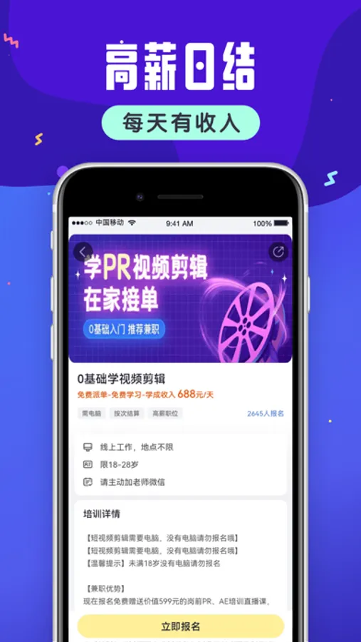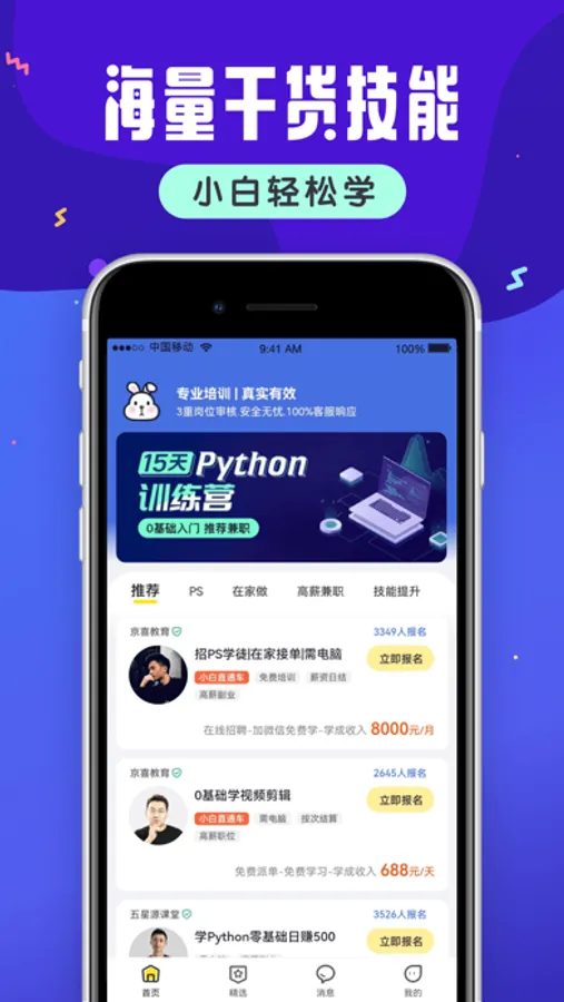 【小白学技能】是一个适合零基础用户学习的技能平台。通过平台可以免费学习PS、视频剪辑、Python编程等数十种干货技能,只需要花费你少许的私人时间,就可以掌握兼职赚取额外收入的能力,同时完成课程后还会推荐接单机会和岗位。
