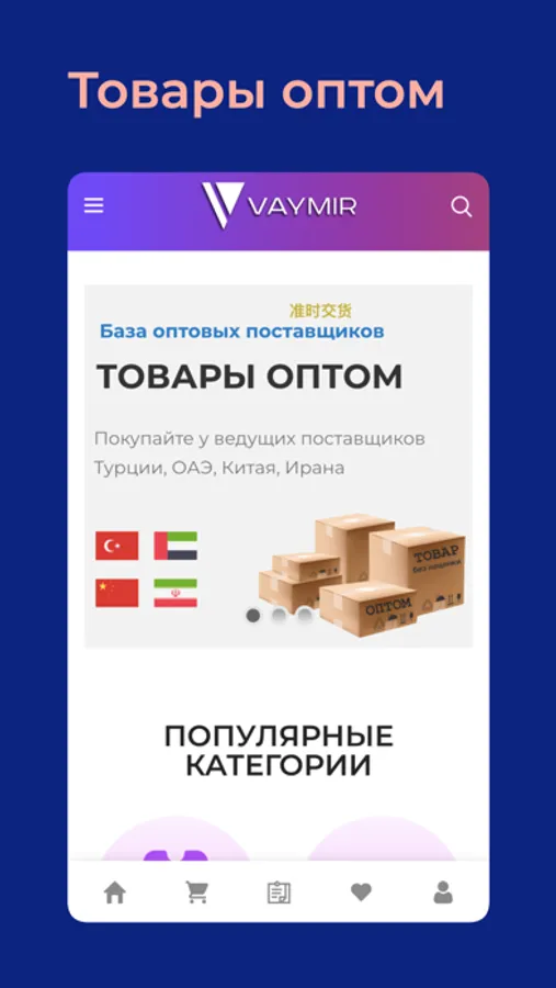 Vaymir — это приложение, которое предоставляет широкий ассортимент товаров для оптовых покупок с карго доставкой и таможенным оформлением. На нашей международной бизнес-платформе вы сможете приобрести: одежду, строительные материалы, электронику и технику, спорттовары, мебель, сырьё, различные оборудования, товары для дома и многое другое.