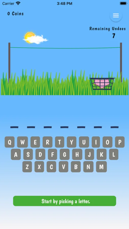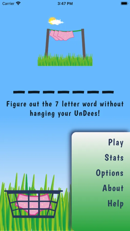 Hang 7, a friendlier version of the traditional hangman game. All words are 7 letters in length, each time you enter a letter that is not in the word, underwear (Undees) are hung on the clothesline. You have 7 pairs of 'Undees' in the basket. Guess the word before you run out!