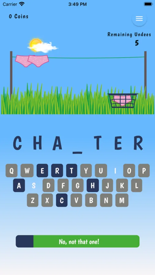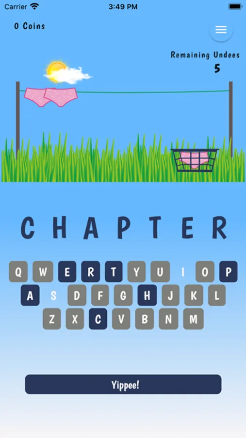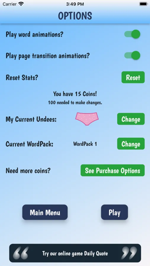 Win the game and collect coins to upgrade your style and WordPacks. The game starts with the standard pink brief and 50 random 7 letter words. You will need to collect 100 coins to change your Undees and 500 coins to get new WordPacks!
