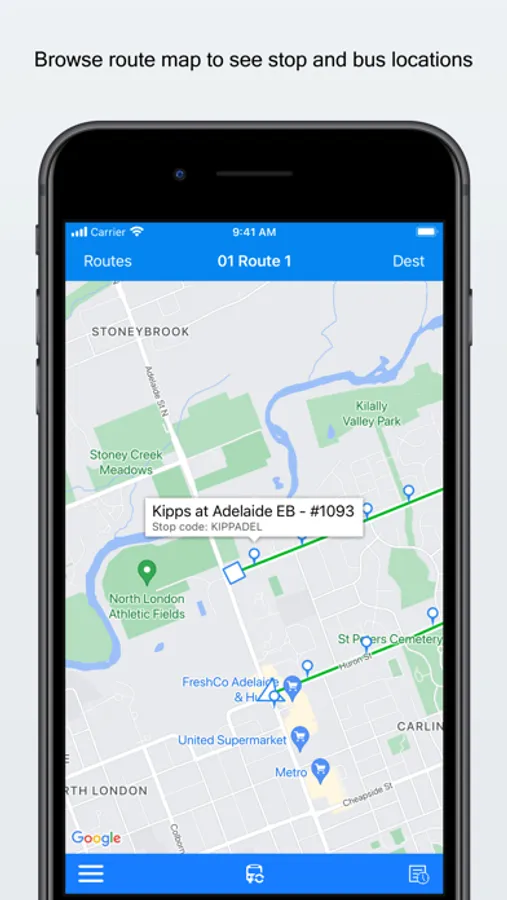 Note: Bus locations are updated based on service available from City of London Transit service. Current refresh rate is set to 2 min.