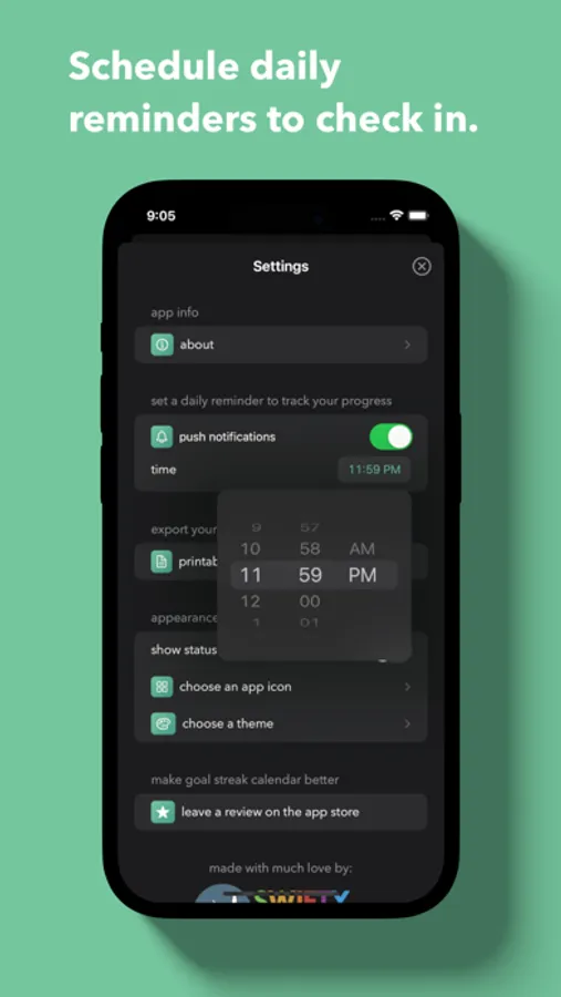 * Schedule daily reminders to track your progress (we never want to annoy you, so these are off by default)