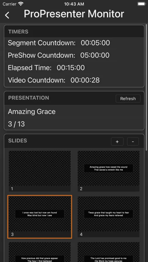 Monitor the status of your ProPresenter presentation from anywhere on your local network. View timers, presentation details, and current slide.