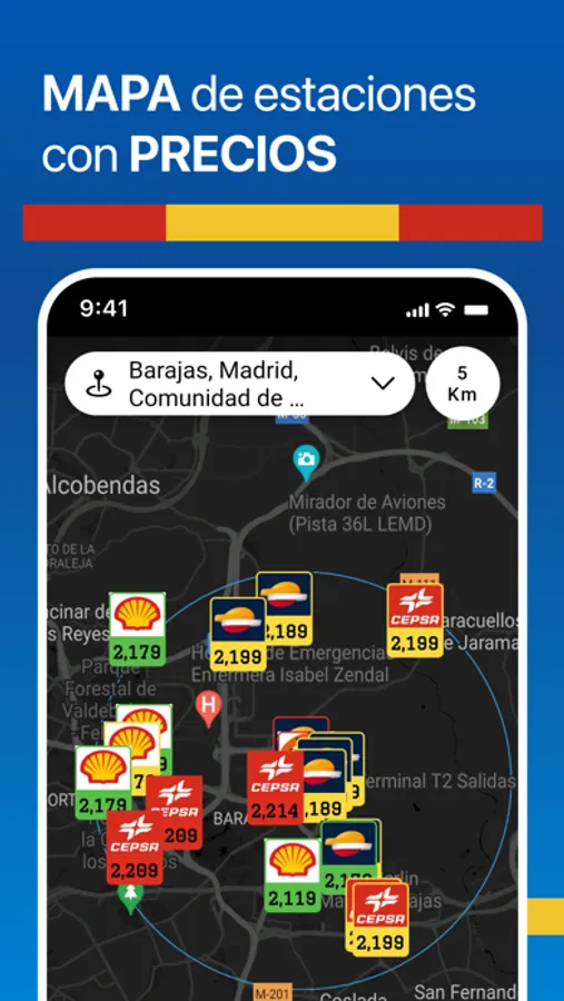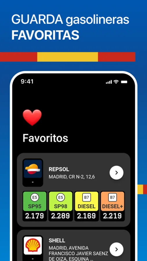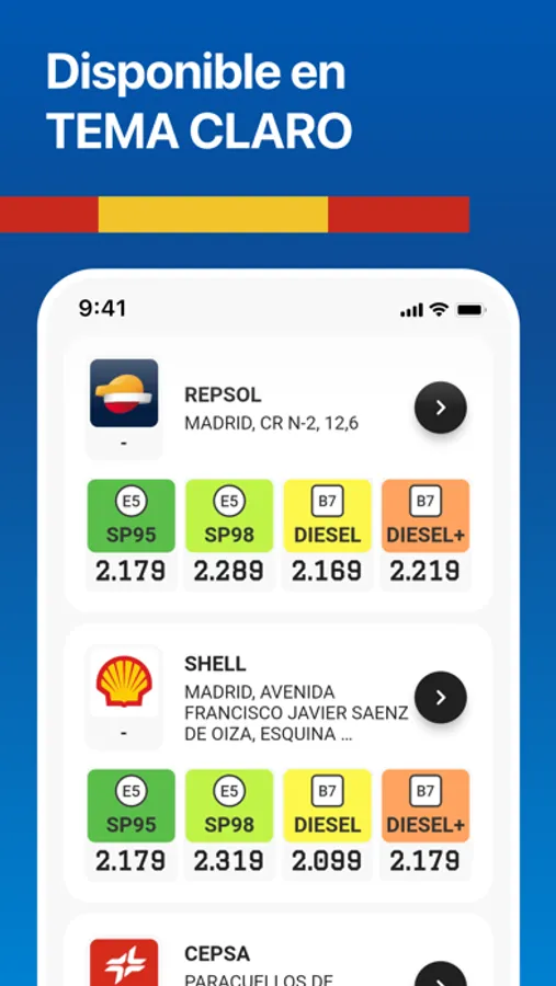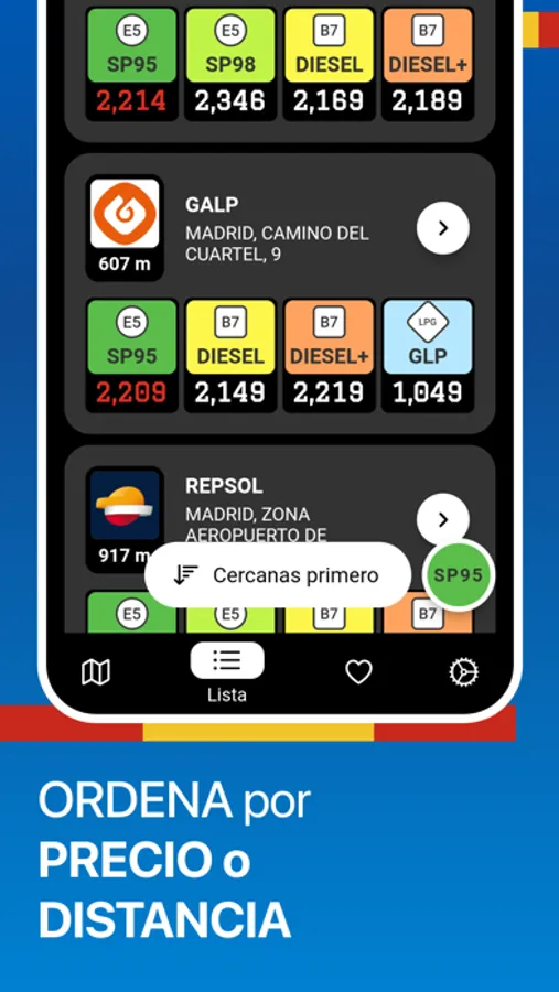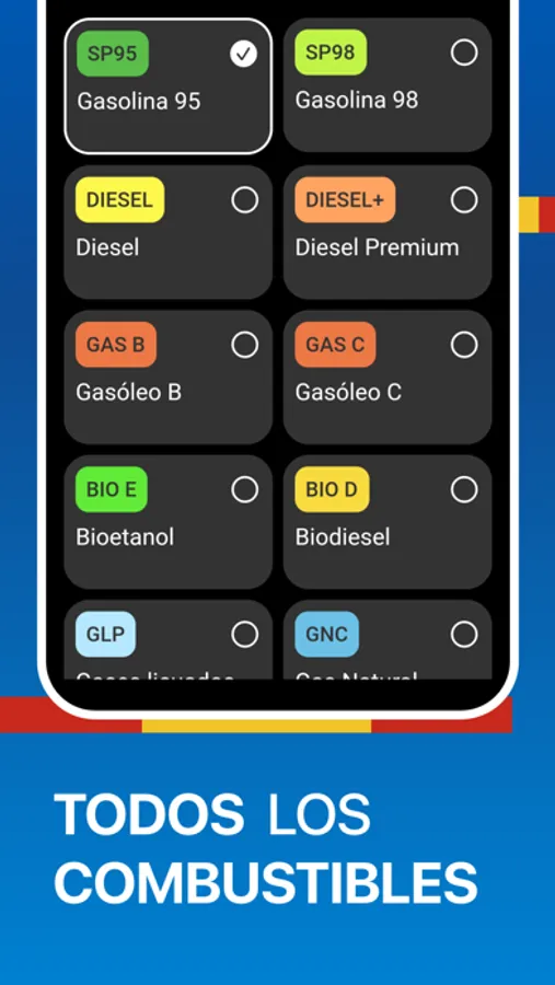 - Elige tu combustible favorito: Gasolina 95, 98, Diesel, Diesel premium, Gasoil, Gasóleo B, Gasóleo C, Bioetanol. Biodiesel, GLP, GNC, GN o H2 Hidrógeno.