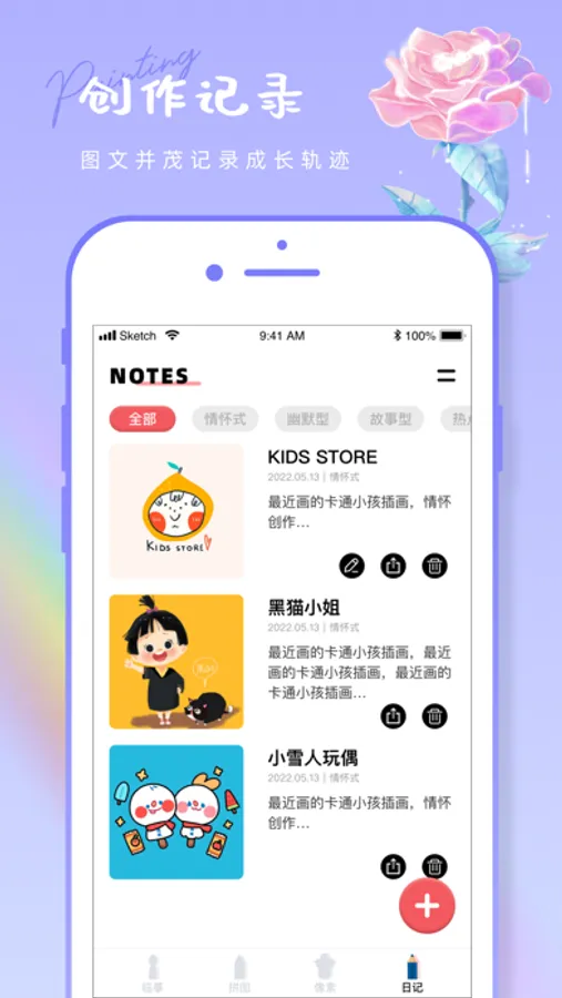 创作:用户可以像记录日记一样,将自己的作品分类记录下来。