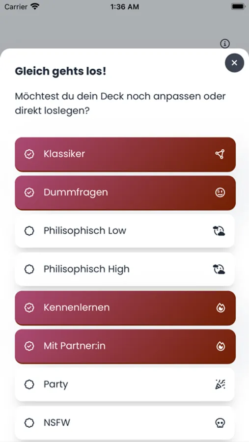 Jedes Deck beinhaltet unterschiedliche Fragen für unterschiedliche Situationen.