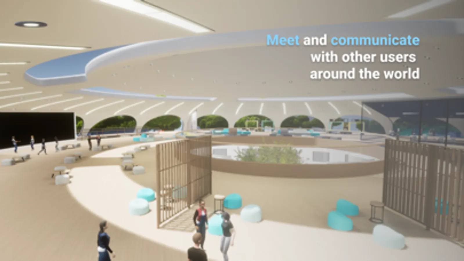 사용자의 아바타 설정 후 파빌리온으로 들어가시면, 아인슈타인이 여러분을 환영해주며 대사관의 공지사항 및 이벤트 현황 확인, 갤러리 감상 등이 가능합니다. 또한 이=엠씨스퀘어 컨퍼런스룸에서는 프라이빗한 대화와 미팅이 가능합니다.