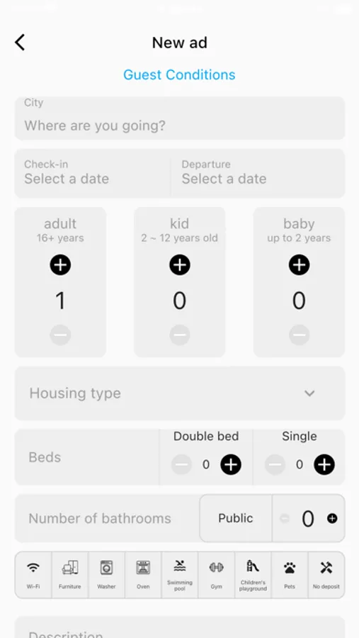 On the main screen of the application, there is a city selection function where you can find ads in different cities and countries. If you have accommodation worldwide, this function is for you!