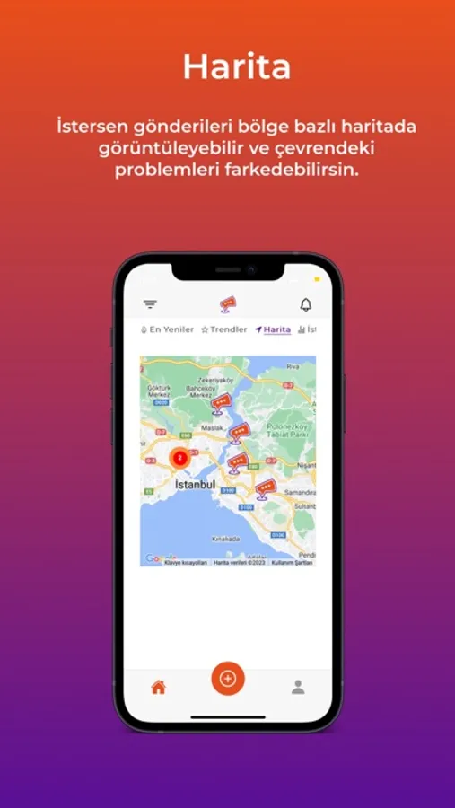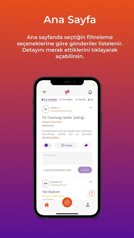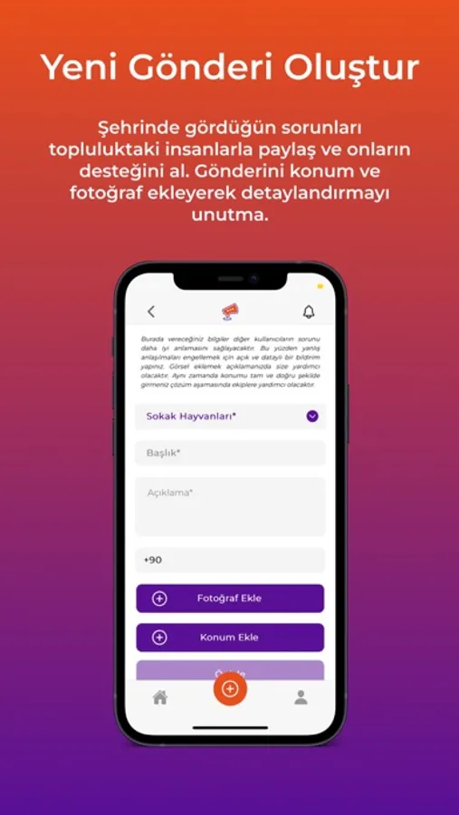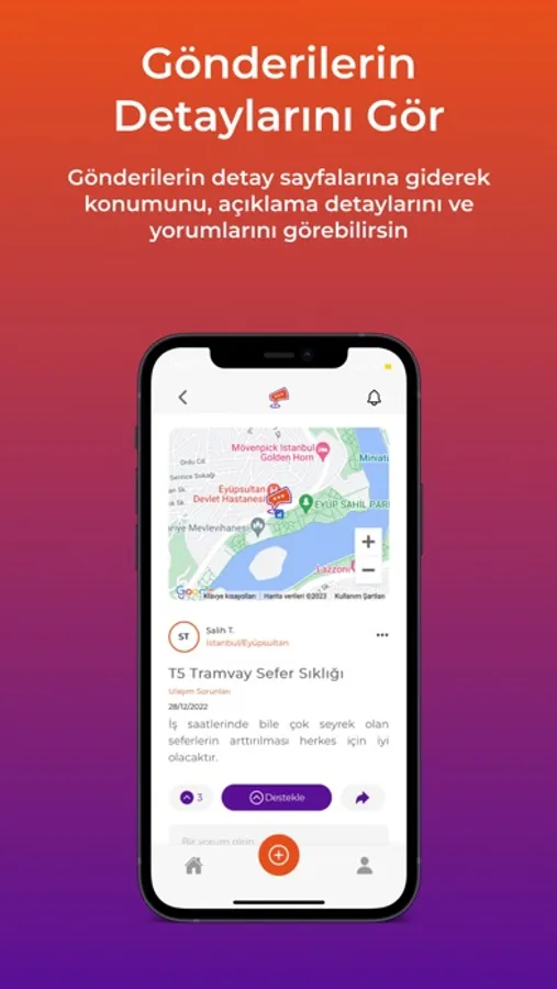 Uygulamamız sayesinde şehirde gördüğün problemleri ve aksaklıkları bölgendeki insanlarla paylaşabilirsin. Bu şekilde bir kamuoyu oluşturarak sorunlara daha hızlı ve etkili çözümler bulmayı hedeflemekteyiz.