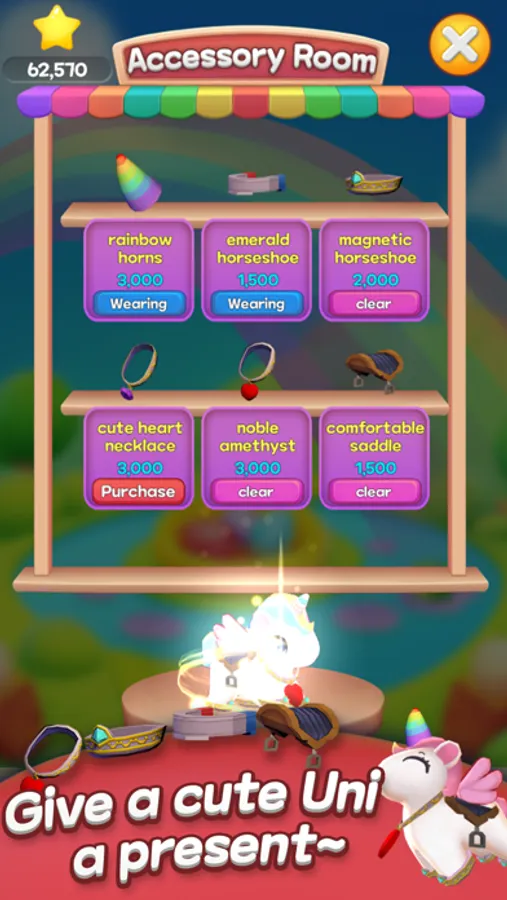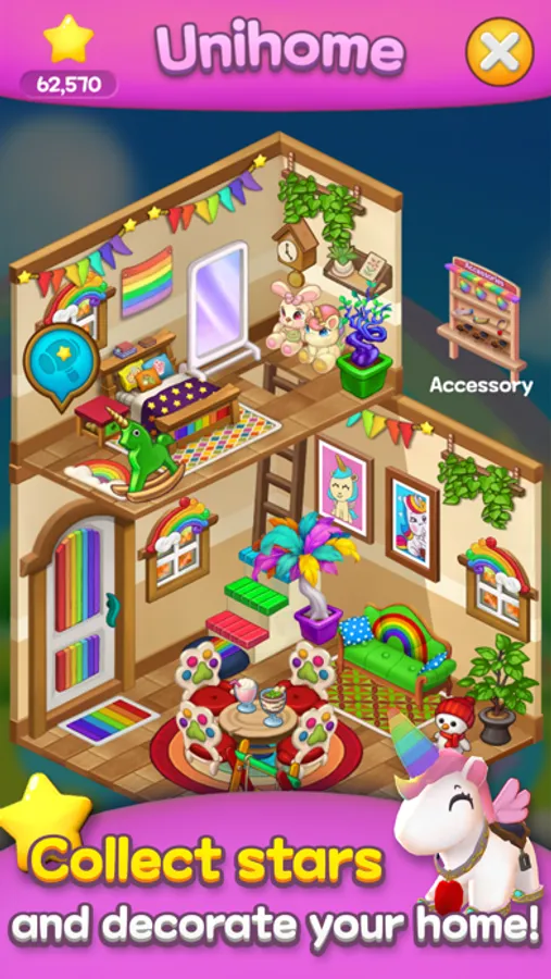 Decorate the house by collecting stars and gift accessories to cute Uni!