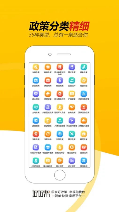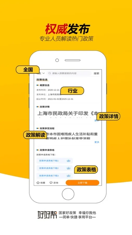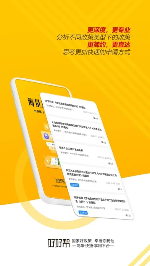 好好帮APP秉承“国家好政策,幸福你我他”的宗旨,是国家政策查询、解读平台,让您一键就能获取海量国家政策,并为个人用户、企业用户提供政策资讯、政策查询、政策解读等服务,是个人用户和企业用户必备的政府政策资讯查询APP,欢迎广大用户下载使用。
