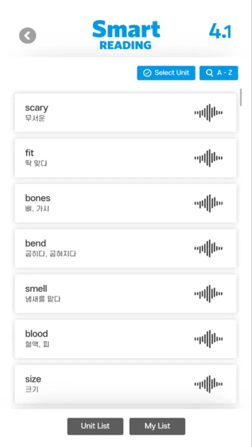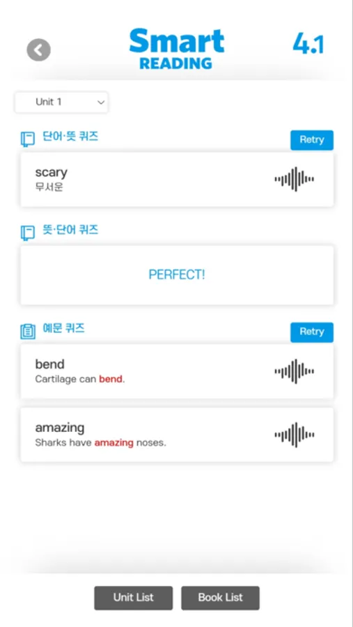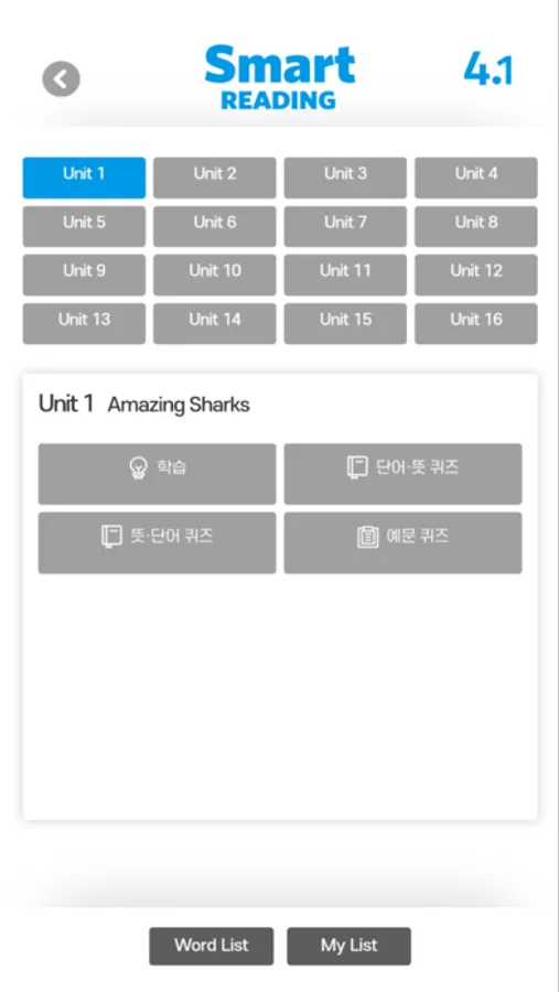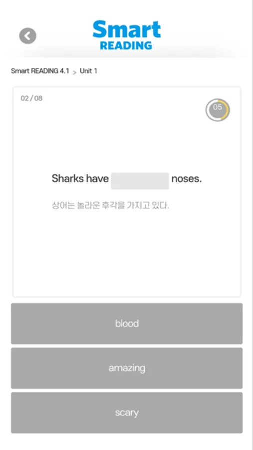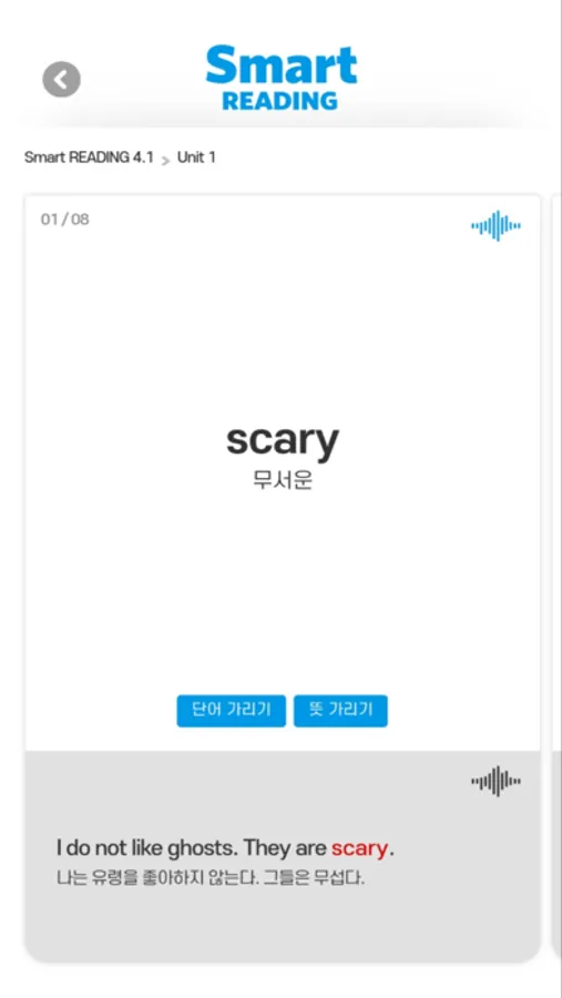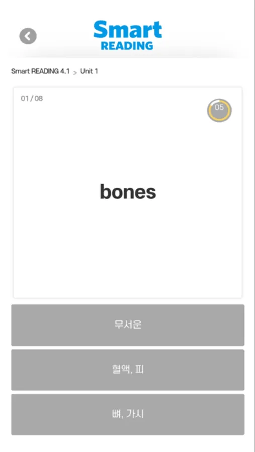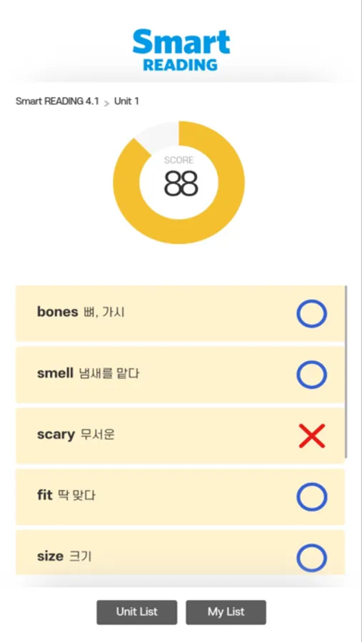 Smart Reading Word App은 Smart Reading 교재의 단어와 문장을 다양한 형태의 퀴즈로 복습할 수 있는 Word App입니다. 학습자는 오답 노트 기능을 통해 틀린 단어를 반복해서 학습함으로써 완벽하게 익힐 수 있습니다.